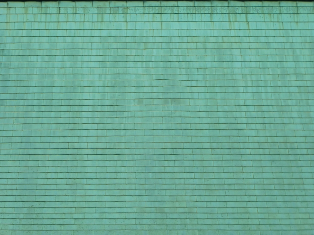 銅板は錆がつきにくく、比較的安価です。10円玉と同様で水に当たると緑青ができて腐食を防ぎます。ただし酸性雨や電食により穴が空きやすいという、銅ならではの特徴もあります。軽量でメンテナンスの必要がなく、期待耐久年数は50年~となります。