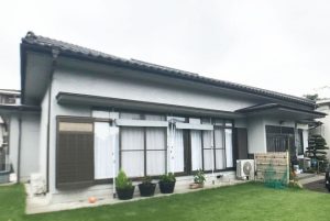 木造平屋の住宅です。最初は屋根のリフォームを検討していたとのこですが、改めて屋根瓦を調査するとまだまだ問題ない状態でした。 その為、外壁塗装のみ実施、多くの外壁塗装現場同様、同じ系統の色で塗装しました。雨が多く続いており予定通り竣工できるか心配もありましたが、 無事に塗装をする事ができました。