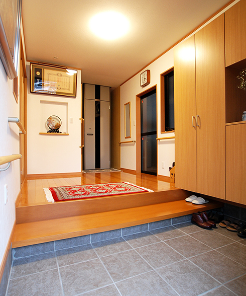 今回の全面改装では、以前、2階へ上がるために車庫側に取り付けたホームエレベーターを活かし、玄関から入った廊下におさめて欲しいとのご要望。エレベーターは37cmほど高くなっていたため、その高さを基準に床のレベルを合わせました。 奥様からのご希望は、玄関とリビングの間の壁にステンドグラスをはめ込みたいとのことで、素敵な仕上がりとなりました。